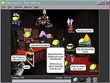 The Palace is a computer program to access graphical chat room servers, called palaces, in which users may interact with one another using graphical avatars overlaid on a graphical backdrop. The software concept was originally created by Jim Bumgardner and produced by Time Warner in 1994, and was first opened to the public in November 1995.