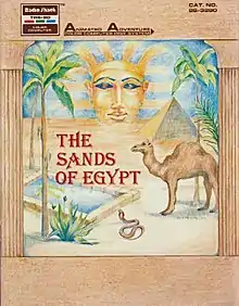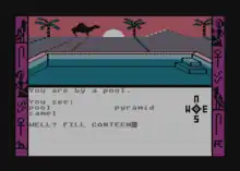 The Sands of Egypt is a 1982 graphic adventure game written by James Garon, Ralph Burris, and Steve Bjork of Datasoft for the TRS-80 Color Computer.[2] It was licensed to Tandy Corporation and was the first disk-only game for the Color Computer sold by RadioShack.[2] Ports to Atari 8-bit computers in 1982 and Apple II in 1983 were published by Datasoft. Set in 1893, the game follows a British explorer and archaeologist who is lost in the desert. Text commands are entered in the lower half of the screen, while a sometimes animated image of the current location is displayed in the upper half.