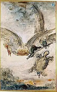 An Italian version of Bidpai's fables was early translated into English by Thomas North under the title of The Morall Philosophie of Doni (1570).[6] The story of the tortoise and the birds appears in a section illustrating the sentiment that 'a man hath no greater enemy than himself'. The French fabulist Jean de la Fontaine also found the story in an early digest of Bidpai's work and added it to his fables as La Tortue et les deux Canards (X.3). For him the story illustrates human vanity and imprudence. His tortoise tires of living in the same place and decides to travel. Two ducks offer to fly her to America but, while on their way, she hears people below describe her as 'the queen of tortoises' and shouts agreement.[7] It is on this that Alexander Sumarokov appears to have based his Russian version, in which the ducks set out to carry the tortoise to France.[8]