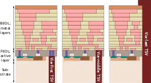Dictated by the manufacturing process, there exist three different types of TSVs: via-first TSVs are fabricated before the individual component (transistors, capacitors, resistors, etc.) are patterned (front end of line, FEOL), via-middle TSVs are fabricated after the individual component are patterned but before the metal layers (back-end-of-line, BEOL), and via-last TSVs are fabricated after (or during) the BEOL process.[1][2] Via-middle TSVs are currently a popular option for advanced 3D ICs as well as for interposer stacks.[2][3]