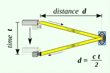 The simplest version of a time-of-flight camera uses light pulses or a single light pulse. The illumination is switched on for a very short time, the resulting light pulse illuminates the scene and is reflected by the objects in the field of view. The camera lens gathers the reflected light and images it onto the sensor or focal plane array. Depending upon the distance, the incoming light experiences a delay. As light has a speed of approximately c = 300,000,000 meters per second, this delay is very short: an object 2.5 m away will delay the light by:[17]