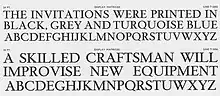 An elegant titling caps design, quite different from Times New Roman with a Caslon-style A (with a serif at top left of the letter, suggesting a stroke written with a quill) and old-style C and W; Tracy suggests Monotype's previous Poliphilus design as an influence.[67] Named after Hever Castle, the home of the Times' owner Lord Astor and designed early on, it was used by the Times for headings in the lighter sections such as society pages, arts and fashion.[63][68] It has not been digitised.