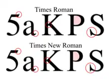 Although Times New Roman and Times are very similar, various differences developed between the versions marketed by Linotype and Monotype when the master fonts were transferred from metal to photo and digital media. For example, Linotype has slanted serifs on the capital S, while Monotype's are vertical, and Linotype has an extra serif on the number 5.[98] Most of these differences are invisible in body text at normal reading distances, or 10pts at 300 dpi. Subtle competition grew between the two foundries, as the proportions and details as well as the width metrics for their version of Times grew apart.[100] Differences between the two versions do occur in the lowercase z in the italic weight (Times Linotype has a curl also followed in the STIX revival, Times New Roman is straight),[29] and in the percent sign in all weights (Linotype and STIX have a stroke connecting up the left-hand zero with a slash, Times New Roman does not). Monotype's 'J' is non-descending, but Linotype's in the bold weight descends below the baseline. Linotype's metal version of Times had a shrunken 'f' due to a technical limitation of the Linotype system—it could not cast a kerning 'f', one that extended into the space of surrounding letters.[101] This restriction was removed in the digital version.[101]