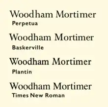Walter Tracy and James Moran, who discussed the design's creation with Lardent in the 1960s, found that Lardent himself had little memory of exactly what material Morison gave him as a specimen to use to design the typeface, but he told Moran that he remembered working on the design from archive photographs of vintage type; he thought this was a book printed by Christophe Plantin, the sixteenth-century printer whose printing office the Plantin-Moretus Museum preserves and is named for.[49] Moran and Tracy suggested that this actually might have been the same specimen of type from the Plantin-Moretus Museum that Plantin had been based on.[50] (Although Plantin is based on a Granjon type in the collection of the museum, that specific type was only acquired by Plantin's heirs after his death.[9]) The sharpened serifs somewhat recall Perpetua, although Morison's stated reason for them was to provide continuity with the previous Didone design and the crispness associated with the Times' printing; he also cited as a reason that sharper serifs looked better after stereotyping or printed on a rotary press.[51] Although Morison may not have literally drawn the design, his influence on its concept was sufficient that he felt he could call it "my one effort at designing a font" in a letter to Daniel Berkeley Updike, a prominent American printing historian with whom he corresponded frequently.[lower-alpha 9] Morison's several accounts of his reasoning in designing the concept of Times New Roman were somewhat contradictory and historians of printing have suggested that in practice they were mostly composed to rationalise his pre-existing aesthetic preferences: after Morison's death Allen Hutt went so far as to describe his unsigned 1936 article on the topic[3] as "rather odd...it can only be regarded as a piece of Morisonian mystification".[52]