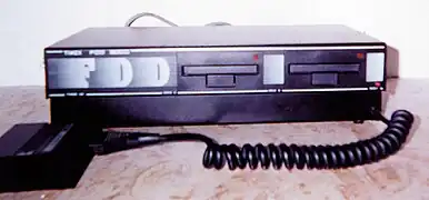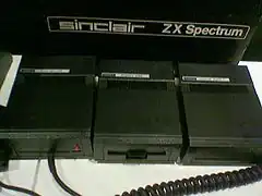 The Timex FDD 3000 is an upgraded Timex FDD (sometimes known as the FDD3 because it consisted of three separate boxes: the disk drive, the controller and the power supply).[3][1][2] The Timex FDD3 was intended as a floppy disk peripheral for the Timex TC 2048 or TC 2068 microcomputers.[3] It usually had 16K RAM and only one 3″ disk drive, but it could be upgraded to 64K RAM and a second disk drive, making it capable of running CP/M. Since the controller is electrically compatible with today's disk drives, it is possible to connect a 3.5″/5.25″ disk drive to the Timex FDD3 Controller (it's also possible to connect a Hitachi 3″ disk drive to an IBM PC Compatible computer).