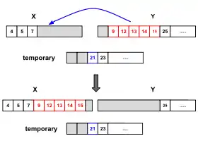 First, Timsort performs a binary search to find the location where the first element of the second run would be inserted in the first ordered run, keeping it ordered. Then, it performs the same algorithm to find the location where the last element of the first run would be inserted in the second ordered run, keeping it ordered. Elements before and after these locations are already in their correct place and do not need to be merged. Then, the smaller of these shrunk runs is copied into temporary memory, and the copied elements are merged with the larger shrunk run into the now free space. If the leftmost shrunk run is smaller, the merge proceeds from left to right. If the rightmost shrunk run is smaller, merging proceeds from right to left (i.e. beginning with elements at the ends of the temporary space and leftmost run, and filling the free space from its end). This optimization reduces the number of required element movements, the running time and the temporary space overhead in the general case.