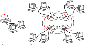 A MAU could present in the form of a hub or a switch; since Token Ring had no collisions many MAUs were manufactured as hubs. Although Token Ring runs on LLC, it includes source routing to forward packets beyond the local network. The majority of MAUs are configured in a 'concentration' configuration by default, but later MAUs also supporting a feature to act as splitters and not concentrators exclusively such as on the IBM 8226.[21]