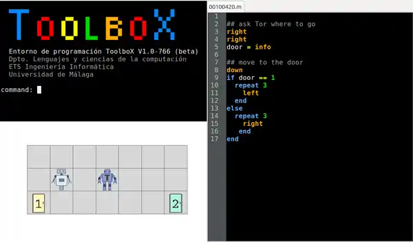 After running ToolboX, the screen is divided into three areas: a system console, a text editor, and a graphic window. By typing the 'task' or 'help' commands in the console, information is obtained on the task modules and the list of available commands. Once a task is loaded with command 'task', 'tip' and 'wiki' might provide additional information. Each task is solved by typing a program on the text editor, and running it with the 'go' command in the console.