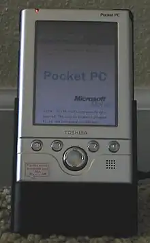 The Toshiba e310 was a personal digital assistant manufactured by Toshiba and first released in 2002.[2][3] It ran Windows Pocket PC 2000 and featured a color 240x320 pixel touch-screen LCD, a 206 MHz CPU, and 32MB of RAM. It was also equipped with a Secure Digital card slot, allowing for the expansion of internal memory and a Lithium-ion battery. A software upgrade was issued by Toshiba in 2003.