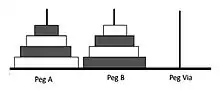 - Move one disk from peg A to peg B or vice versa, whichever move is legal.