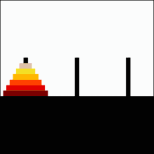 A simple solution for the toy puzzle is to alternate moves between the smallest piece and a non-smallest piece. When moving the smallest piece, always move it to the next position in the same direction (to the right if the starting number of pieces is even, to the left if the starting number of pieces is odd). If there is no tower position in the chosen direction, move the piece to the opposite end, but then continue to move in the correct direction. For example, if you started with three pieces, you would move the smallest piece to the opposite end, then continue in the left direction after that. When the turn is to move the non-smallest piece, there is only one legal move. Doing this will complete the puzzle in the fewest moves.[13]
