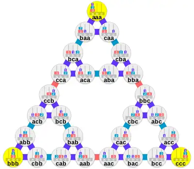 The nodes at the vertices of the outermost triangle represent distributions with all disks on the same peg.