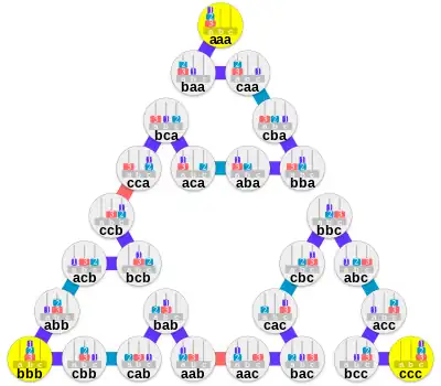 The rules of the puzzle are essentially the same: disks are transferred between pegs one at a time. At no time may a bigger disk be placed on top of a smaller one. The difference is that now for every size there are two disks: one black and one white. Also, there are now two towers of disks of alternating colors. The goal of the puzzle is to make the towers monochrome (same color). The biggest disks at the bottom of the towers are assumed to swap positions.