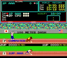 Players compete in a series of events, most involving alternately pressing two buttons as quickly as possible to make the onscreen character run faster. It has a horizontal side-scrolling format, depicting one or two tracks at a time, a large scoreboard that displays world records and current runs, and a packed audience in the background.[7]