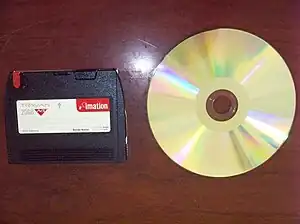 Travan is an 8 mm magnetic tape cartridge design developed by the 3M company, used for the storage of data in computer backups and mass storage.[1] Over time, subsequent versions of Travan cartridges and drives have been developed that provide greater data capacity, while retaining the standard 8 mm width and 750' length. Travan is standardized under the QIC body. HP Colorado, Iomega DittoMax and AIWA Bolt are proprietary versions of the Travan format.[2]