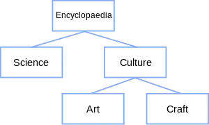 In the example, "encyclopedia" is the parent of "science" and "culture", its children. "Art" and "craft" are siblings, and children of "culture", which is their parent and thus one of their ancestors. Also, "encyclopedia", as the root of the tree, is the ancestor of "science", "culture", "art" and "craft". Finally, "science", "art" and "craft", as leaves, are ancestors of no other node.