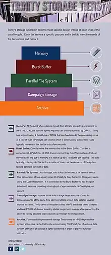 Trinity uses a Sonexion based Lustre file system with a total capacity of 78 PB. Throughput on this tier is about 1.8 TB/s (1.6 TiB/s). It is used to stage data in preparation for HPC operations. Data residence in this tier is typically several weeks.