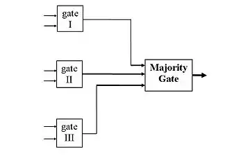 Assuming the Boolean function computed by the three identical logic gates has value 1, then: (a) if no circuit has failed, all three circuits produce an output of value 1, and the majority gate output has value 1. (b) if one circuit fails and produces an output of 0, while the other two are working correctly and produce an output of 1, the majority gate output is 1, i.e., it still has the correct value. And similarly for the case when the Boolean function computed by the three identical circuits has value 0. Thus, the majority gate output is guaranteed to be correct as long as no more than one of the three identical logic circuits has failed.[7]