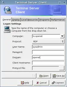 Features include: a GNOME panel applet to quickly launch saved profiles, sound support, similar look and functionality to the Microsoft client and compatibility with its file format, interface translated into more than 20 languages, and support for rdesktop 1.3, Xnest and VNC clients (*vncviewer).