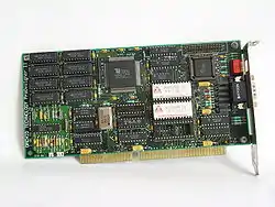 The ET4000AX was a major advancement over Tseng Labs' earlier ET3000 SVGA chipset, featuring a new 16-bit host interface controller with deep FIFO buffering and caching capabilities, and an enhanced, variable-width memory interface with support for up to 1MB of memory with a ≈16-bit VRAM or ≈32-bit DRAM memory data bus width. The FIFO buffers and cache functions had the effect of greatly improving host interface throughput, and therefore offering substantially improved redraw performance compared to the ET3000 and most of its contemporaries. The interface controller also offered support for IBM's MCA bus, in addition to an 8 or 16-bit ISA bus.[1] The ET4000AX could also support the emerging VESA Local Bus standard with some additional external logic, albeit with a 16-bit host bus width.