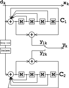 In the figure, M is a memory register. The delay line and interleaver force input bits dk to appear in different sequences. At first iteration, the input sequence dk appears at both outputs of the encoder, xk and y1k or y2k due to the encoder's systematic nature. If the encoders C1 and C2 are used in n1 and n2 iterations, their rates are respectively equal to