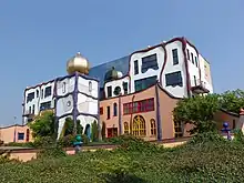 The development of modern architecture in the region has been closely related to its industrial development in the 19th and 20th century, as can be recognized in multiple factory complexes, public buidlings, as well as housing projects, including garden villages such as Tuindorp 't Lansink (1910s, arch. Karel Muller).[4] Many well-known names within Dutch architectural history have left their traces in the region, among them Piet Blom, Van den Broek & Bakema, Willem Dudok, Han van Loghem, and Gerrit Rietveld, to name but a few. Of particular interest is the architecture at the campus of the Universiteit Twente,[5] located in Enschede, built in 1961 according to the masterplan by Wim van Tijen and Samuel van Embden. Other examples of modern and contemporary architecture can be found in Enschede too, as well as in the other main urban centres, Almelo and Hengelo, but also in some smaller towns. In the town of Goor, for example, a construction company has built their main office in the style of Friedensreich Hundertwasser, who was known for using lively colours and natural forms.