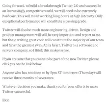 Days after the layoffs, Twitter terminated a large number of its contractors,[24][25] and Musk fired a series of employees who criticized him publicly or within the company.[26] On November 16, Musk delivered an ultimatum to employees via email: commit to "extremely hardcore" work in order to realize Musk's vision of "Twitter 2.0", or leave.[27][28] In response, hundreds of Twitter employees resigned the next day, hours before the deadline to respond to Musk's email, rendering many of Twitter's core functions nonviable.[29][30] Business Insider reported that fewer than 2,000 employees remained at the company.[31] Musk and his advisers met with several employees to dissuade them from leaving the company,[32] while Twitter offices were once again closed until November 21.[33][34] Despite the closures, Musk summoned all Twitter software engineers to Twitter's headquarters on November 18, seeking greater insight into the platform's solution stack.[35] Additional layoffs occurred later that month,[36] and the company resumed hiring.[37] Musk continued laying off employees in February 2023,[38][39] promising substantial "performance-based stock awards" to employees who remained at the company.[40]