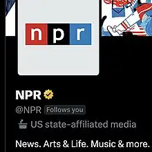 In April 2023, Twitter designated National Public Radio's main account as "US state-affiliated media", a label that was typically reserved for foreign media outlets that directly represented the point of view of their respective governments, like Russia's RT and China's Xinhua.[177] Twitter's decision was controversial; though established by an act of Congress, NPR is an independent news organization that only receives a fraction of its funding through government programs. Twitter's previous policy had explicitly mentioned NPR, as well as the United Kingdom's BBC, as examples of networks that were not considered state-affiliated due to their editorial independence.[178][179] NPR ceased activity on its main Twitter account in response to the designation.[180] As of October 2023, NPR still no longer uses Twitter, with the media outlet describing the effects on traffic as negligible.[181][182][183]