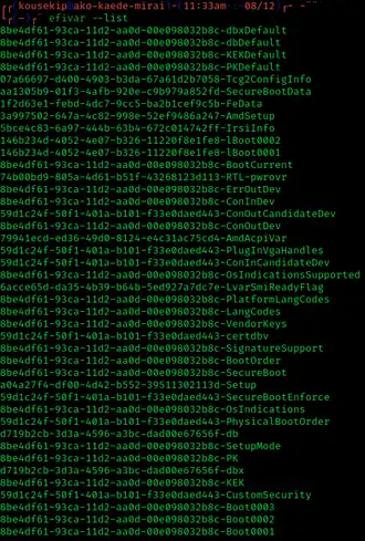 - UEFI variables provide a way to store data, in particular non-volatile data. Some UEFI variables are shared between platform firmware and operating systems. Variable namespaces are identified by GUIDs, and variables are key/value pairs. For example, UEFI variables can be used to keep crash messages in NVRAM after a crash for the operating system to retrieve after a reboot.[44]