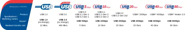 | Max Speed | Marketing name (operation mode) | Low-Speed & Full-Speed | High-Speed | SuperSpeed USB 5Gbps, original: SuperSpeed (Gen 1) | SuperSpeed USB 10 Gbps, original: SuperSpeed+ (Gen 2) | SuperSpeed USB 20 Gbps (USB 3.2 Gen 2×2) | USB4 40 Gbps (USB4 Gen 3×2) | USB4 80 Gbps (USB4 Gen 4) | ||