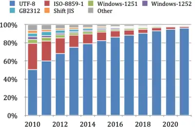 UTF-8 is the dominant encoding for the World Wide Web (and internet technologies), accounting for 98.2% of all web pages, 99.1% of the top 100,000 pages, and up to 100% for many languages, as of 2024.[9] Virtually all countries and languages have 95% or more use of UTF-8 encodings on the web.