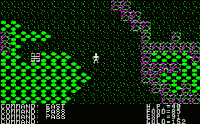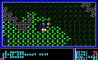 The world of Ultima is presented in a variety of different ways. The overworld is projected in a topdown, third-person view, while dungeons are displayed in first-person, one-point perspective.[4] In both scenarios the player character is controlled with the keyboard directional arrows, and shortcut keys are used for other commands, such as A for attack and B for board.[8]