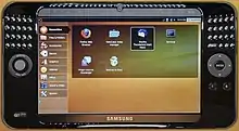 An ultra-mobile PC,[1] or ultra-mobile personal computer (UMPC), is a miniature version of a pen computer, a class of laptop whose specifications were launched by Microsoft and Intel in Spring 2006. Sony had already made a first attempt in this direction in 2004 with its Vaio U series, which was only sold in Asia. UMPCs are generally smaller than subnotebooks, have a TFT display measuring (diagonally) about 12.7 to 17.8 centimetres (5.0 to 7.0 in), are operated like tablet PCs using a touchscreen or a stylus, and can also have a physical keyboard. There is no clear boundary between subnotebooks and ultra-mobile PCs, but UMPCs commonly have major features not found in the common clamshell laptop design, such as small keys on either side of the screen, or a slide-out keyboard.