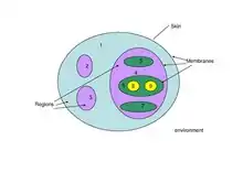 Membrane computing, also known as P systems,[46] is a subfield of computer science that studies distributed and parallel computing models based on the structure and function of biological membranes. In these systems, objects such as symbols or strings are processed within compartments defined by membranes, and the communication between compartments and with the external environment plays a critical role in the computation. P systems are hierarchical and can be represented graphically, with rules governing the production, consumption, and movement of objects within and between regions. While these systems have largely remained theoretical,[47] some have been shown to have the potential to solve NP-complete problems and have been proposed as hardware implementations for unconventional computing.
