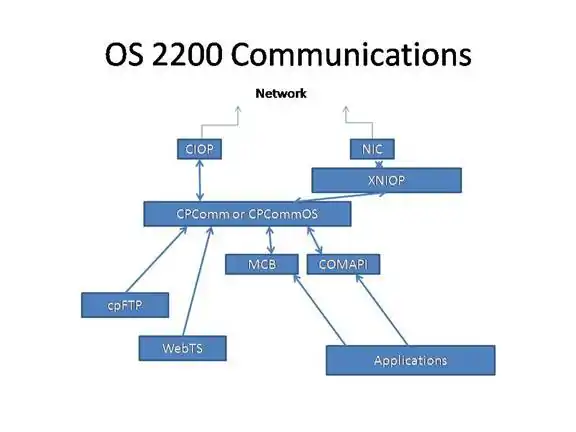 CPComm communicates with the CIOP (Communications I/O Processor) to connect to networks. CPcommOS is a variant for 2200 Series systems implemented on Intel architectures. In the most recent systems only various speeds of Ethernet communications are supported. Previous systems supported ATM and FDDI but these were dropped through lack of interest.