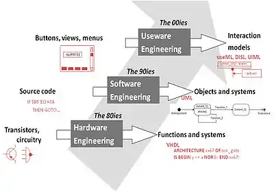 Consequently, Useware engineering developed in a similar way to the development of engineering processes (see Fig. 2). This reinforces the principal demand for structured development of user-centered user interfaces, as advocated by Ben Shneiderman.[4] After many years of function-oriented development, human abilities and needs are brought into focus. The only promising method to develop future technology products and systems is to understand the users’ abilities and limitations and to aim the technology in that direction.[1]