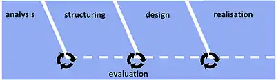 The Useware development process involves the following steps: analysis, structural design, design, realization, and evaluation. These steps should not be considered in isolation but rather as overlapping stages. Maintaining continuity throughout the process and employing appropriate tools, such as those based on the Extensible Markup Language (XML), helps prevent information loss and breaks in media.
