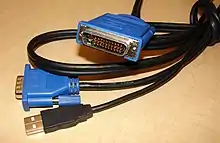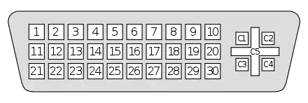 A VESA EVC connector is capable of carrying analog video (VGA-based) output, video input (composite or S-video), FireWire, analog stereo audio (input and output), and USB signals. Analog video is carried by the C1–C4 pins surrounding the C5 crossed ground plane; this was a development of the 13W3 connector, which was typically fitted to high-end workstations and had three miniature coaxial terminals embedded in the connector. The quasi-coaxial "MicroCross" developed by Molex provided comparable shielding performance with a simpler assembly. The physical arrangement of the EVC pins is identical to the newer VESA Plug and Display (P&D), which carries digital video over the pins used in EVC to carry analog audio (input and output) and video input.[2]: §1.3.3.1 The connectors can be distinguished by the shape of the shell: the shell of the EVC connector is shaped like an isosceles trapezoid, similar to the shell of a D-subminiature connector, while the P&D connector instead has a D-shaped shell, similar to a DVI connector.