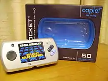The VG Pocket Caplet is a dedicated console created by Performance Designed Products. Its graphics are considered an improvement over those of the earlier models of the VG Pocket, with a very bright 2.5" backlit 320×240 TFT display (the package claims its resolution is 960×240, counting the RGB triads to make 3× the number of pixels). It is a 16-bit system that appears to utilize some form of arcade emulation, since the majority of its games are either direct ports or clones of arcade games. The unit has the capability of being displayed on any TV set with the purchase of a separate "starter kit" that includes a storage carrying case and special AV cables unique to the system. There are no save features for high scores or game progress. Caplet comes in four colors: blue, silver, red, orange; and is powered by 3 AAA batteries.