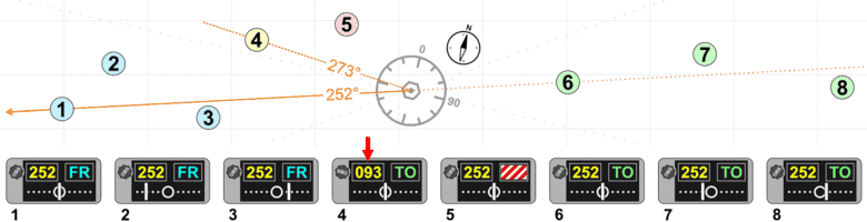 In the illustration on the right, notice that the heading ring is set with 360° (north) at the primary index, the needle is centred and the To/From indicator is showing "TO". The VOR is indicating that the aircraft is on the 360° course (north) to the VOR station (i.e. the aircraft is south of the VOR station). If the To/From indicator were showing "From" it would mean the aircraft was on the 360° radial from the VOR station (i.e. the aircraft is north of the VOR). Note that there is absolutely no indication of what direction the aircraft is flying. The aircraft could be flying due West and this snapshot of the VOR could be the moment when it crossed the 360° radial.