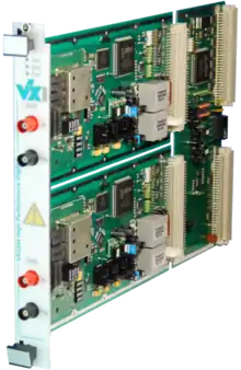 VME eXtensions for instrumentation bus (VXI bus) refers to standards for automated test based upon VMEbus. VXI defines additional bus lines for timing and triggering as well as mechanical requirements and standard protocols for configuration, message-based communication, multi-chassis extension, and other features. In 2004, the 2eVME extension was added to the VXI bus specification, giving it a maximum data rate of 160 MB/s.