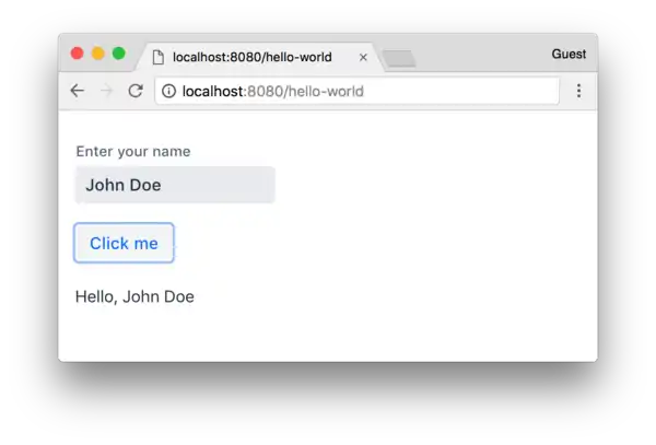 Vaadin Flow's Java API includes classes such as TextField, Button, ComboBox, Grid, and many others that can be configured, styled, and added into layout objects instances of classes such as VerticalLayout, HorizontalLayout, SplitLayout, and others. Behaviour is implemented by adding listeners to events such as clicks, input value changes, and others. Views are created by custom Java classes that implement another UI component (custom or provided by the framework). This view classes are annotated with @Route to expose them to the browser with a specific URL. The following example illustrates these concepts: