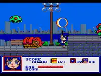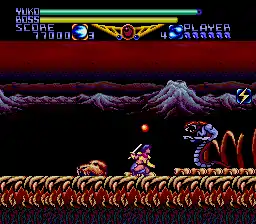 The player controls Yuko through two-dimensional levels, battling enemies, jumping from ledge to ledge, and running until the player faces a boss at the end of each level. At certain points in the game, gameplay pauses, and cinematic cutscenes play regarding the game's storyline.[2] The home computer versions feature two shoot 'em up-like stages where Yuko flies over a constantly scrolling background.[2] This version also introduces a separate menu inventory where the player can choose power-ups found during levels, as well as costumes that alters Yuko's overall offensive and defensive attributes.[2] The Mega Drive/Genesis remake is an amalgamation of both the PC Engine CD-ROM²/TurboGrafx-CD original and the home computer versions, featuring the ability to select power-ups and costumes.[3] Yuko can also shoot projectiles upward against enemies.[3] However, the game's physics are different, while characters interact via in-game text boxes.[3]