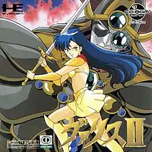 Valis II[lower-alpha 2] is a 1989 action-platform video game originally developed by Laser Soft, published by Telenet Japan and NEC for the PC Engine CD-ROM²/TurboGrafx-CD. A home computer version was released for PC-8801, MSX2, PC-9801 and X68000. A super deformed-style remake was also released in 1992 for the Sega Mega Drive/Genesis. It is the second entry in the eponymous series. It stars Yuko Asou, a Japanese schoolgirl teenager chosen to become the Valis warrior by wielding the titular mystical sword, after defeating the demon lord Rogles. The dream world Vecanti fell under the rule of emperor Megas, whose hatred towards his brother Rogles and bloodthirsty tendencies seeks to wipe out traces of the former tyrant, including his supporters. Gameplay varies between each version but all share similar elements, as the player explores and search for items and power-ups, while fighting enemies and defeat bosses.