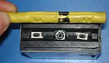 A vampire tap (also called a piercing tap) is a device for physically connecting a station, typically a computer, to a network that used 10BASE5 cabling. This device clamped onto and "bit" into the cable[1] (hence the name "vampire"), inserting a probe through a hole drilled using a special tool through the outer shielding to contact the inner conductor, while other spikes bit into the outer conductor.