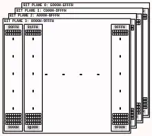 The frame buffer of Vector-06C is unusual for home computers. The memory is organized as 4 bit planes, palette index of each individual pixel is formed from individual bits in 4 planes. Thus the highest colour mode has 24=16 simultaneously displayed colours. The bit planes are defined as follows: a byte represents a horizontal span of 8 pixels. Next byte in video memory represents a span of 8 pixels above it and so on. Thus a bit plane in 256×256 mode can be viewed as 8-pixel wide columns, growing bottom-to-top, left-to-right; whole screen is thus covered by 32 columns.
