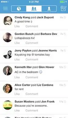 Venmo includes social networking interaction; it was created so friends could quickly split bills, whether that is for movies, dinner, rent, tickets, etc. When a user makes a transaction, the transaction details (stripped of the payment amount) are shared on the user's "news feed" and to the user's network of friends.[32] This mimics that of a social media feed. There is a "world wide" Venmo feed, a "friends only" feed, and then personal feed. Venmo encourages social interaction on the application through comments[33] using jokes or emojis and/or likes. In 2016, around 30% of approved Venmo transactions included at least one emoji.[34]