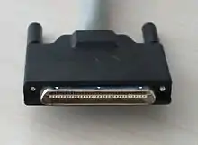 A very-high-density cable interconnect (VHDCI) is a 68-pin connector that was introduced in the SPI-2 document of SCSI-3.[1] The VHDCI connector is a very small connector that allows placement of four wide SCSI connectors on the back of a single PCI card slot. Physically, it looks like a miniature Centronics type connector. It uses the regular 68-contact pin assignment. The male connector (plug) is used on the cable and the female connector ("receptacle") on the device.
