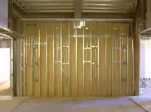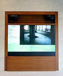Video walls are sometimes found in control rooms, stadiums, and other large public venues. Examples include the video wall in Oakland International Airport's baggage claim,[11] where patrons are expected to observe the display at long distances, and the 100 screen video wall at McCarran International Airport, which serves as an advertising platform for the 40 million passengers passing through airport annually.[12] Video walls can also benefit smaller venues when patrons may view the screens both up close and at a distance, respectively necessitating both high pixel density and large size. For example, the 100-inch video wall located in the main lobby of the Lafayette Library and Learning Center has enough size for the distant passerby to view photos while also providing the nearby observer enough resolution to read about upcoming events.[13]