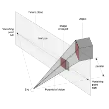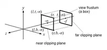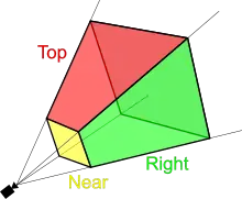 The view frustum is typically obtained by taking a geometrical frustum—that is a truncation with parallel planes—of the pyramid of vision, which is the adaptation of (idealized) cone of vision that a camera or eye would have to the rectangular viewports typically used in computer graphics.[3][4] Some authors use pyramid of vision as a synonym for view frustum itself, i.e. consider it truncated.[5]
